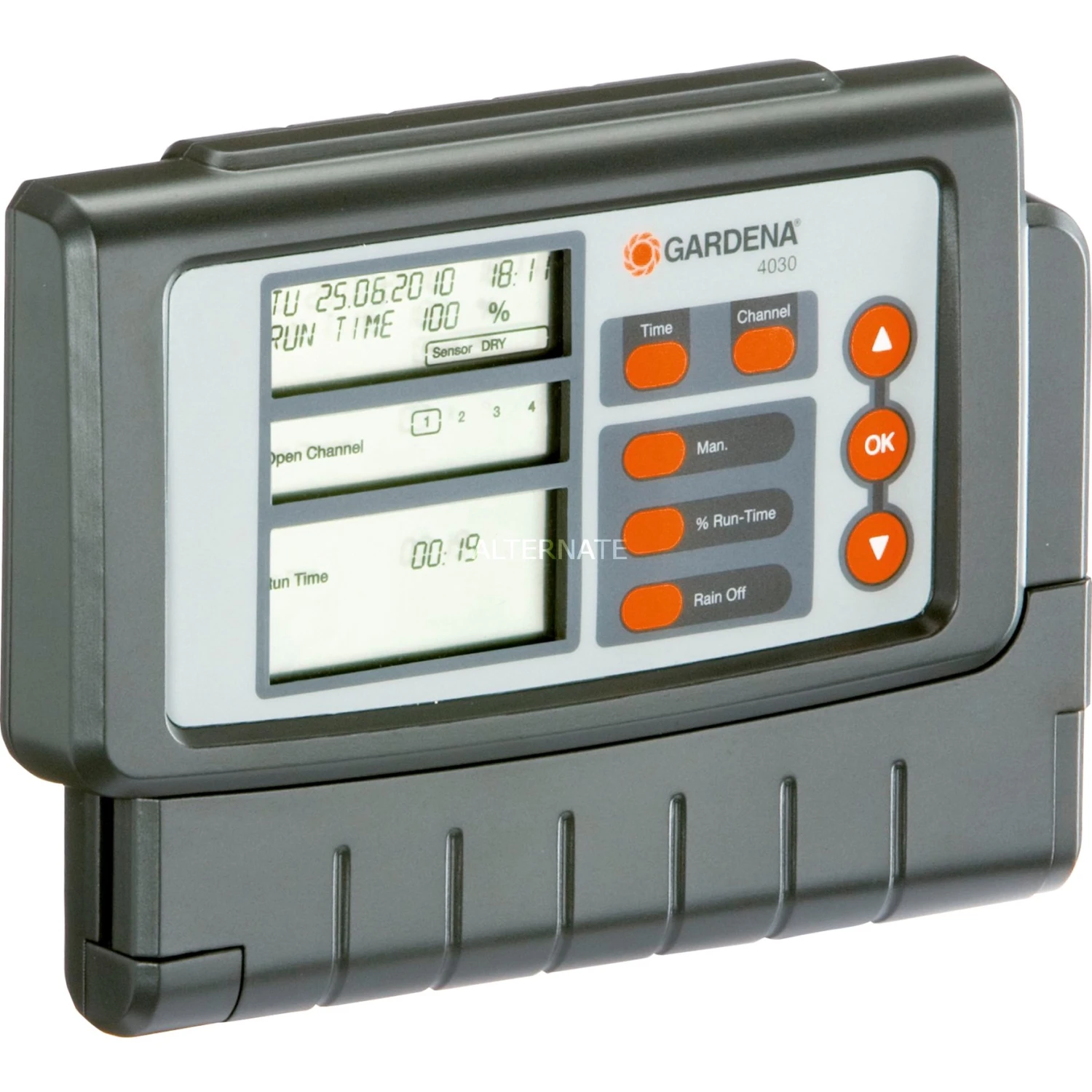 Die GARDENA Classic Bewässerungssteuerung 4030 dient zur automatischen Steuerung von größeren Bewässerungsanlagen, meist von Versenkberegnungsanlagen wie dem GARDENA Sprinklersystem. Die Classic Bewässerungssteuerung 4030 wird insbesondere dann eingesetzt, wenn die Wassermenge nicht ausreicht, um die Gesamtanlage aus mehreren Bewässerungssystemen gleichzeitig zu betreiben. Auch bei unterschiedlichem Wasserbedarf einzelner Pflanzbereiche regelt sie die individuellen Bewässerungsintervalle pro Strang und sorgt so für eine individuelle und optimale Bewässerung. Die Classic Bewässerungssteuerung 4030 ist für den Anschluss von bis zu vier Bewässerungsventilen 24 V ausgelegt. Die Bewässerungstage und -zyklen sind individuell wählbar, die Bewässerungsdauer kann zwischen einer Minute und 3 Stunden 59 Minuten eingestellt werden und ist zudem zentral von 0 bis 200% veränderbar. Soll die Bewässerung einmal sofort gestartet werden, lässt sie sich auch manuell aktivieren. Das große übersichtliche Display mit Benutzerführung macht die Programmierung einfach und intuitiv. Die GARDENA Classic Bewässerungssteuerung 4030 kann sowohl im Innenbereich, wie in der Garage, als auch an regengeschützen Orten im Freien eingesetzt werden und hat einen 230 V-Netzanschluss. Damit die Bewässerungssteuerung immer zuverlässig und sicher erfolgt, ist eine Netzausfallsicherung durch eine 9 V Alkaline Batterie möglich (Batterie nicht enthalten).