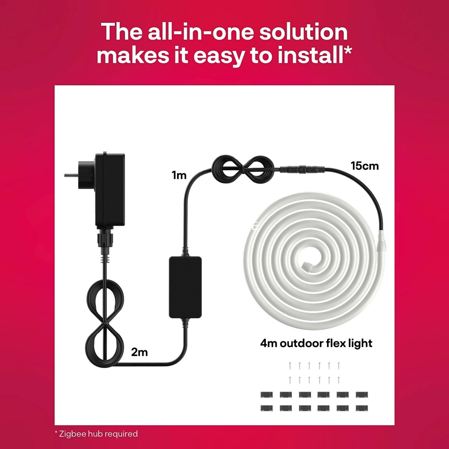 Das Outdoor Flex Light Colour von INNR bringt flexible, steuerbare Beleuchtung auf den Balkon, die Terrasse oder in den Garten. Dieser LED-Streifen erzeugt auf vier Metern Länge ein warm- bis kaltweißes oder bei Bedarf farbiges Licht mit bis zu 660 Lumen. Dabei kann er per App oder Sprachsteuerung gesteuert werden und lässt sich dank Zigbee-Protokoll in bereits bestehende Netzwerke integrieren.