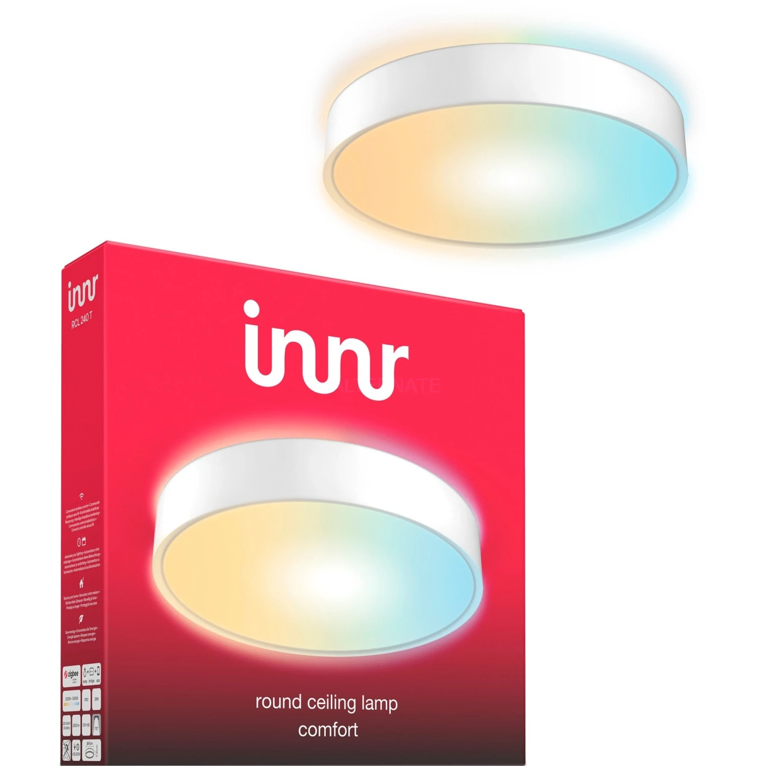 Die Smart Round Ceiling Lamp Comfort von INNR sorgt für stilvolle, warmweiße bis kaltweiße Beleuchtung. Diese Deckenleuchte hat einen Durchmesser von etwa 41 Zentimetern und unterstützt des Zigbee-Protokoll. Damit ist die per App und Sprachsteuerung steuerbar – vom einfachen Dimmen bis hin zu der Stimmung angepasster Beleuchtung oder zeitgesteuerten Beleuchtungsszenarien.