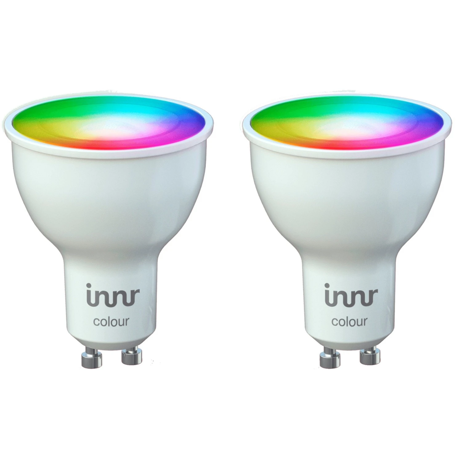 Der Smart Spot Colour von INNR ist eine per Zigbee-Protokoll steuerbare LED-Lampe mit Spot-Formfaktor und GU10-Sockel. Sie kann über die die INNR-App über iOS oder Android auch aus der Ferne gesteuert werden und erzeugt ein farbiges Licht mit bis zu 350 Lumen und Millionen möglichen Farben, das jeden Raum zu einer Wohlfühloase macht und vielfältige Stimmungsanpassungen erlaubt. Dieses Pack enthält zwei Leuchtmittel.