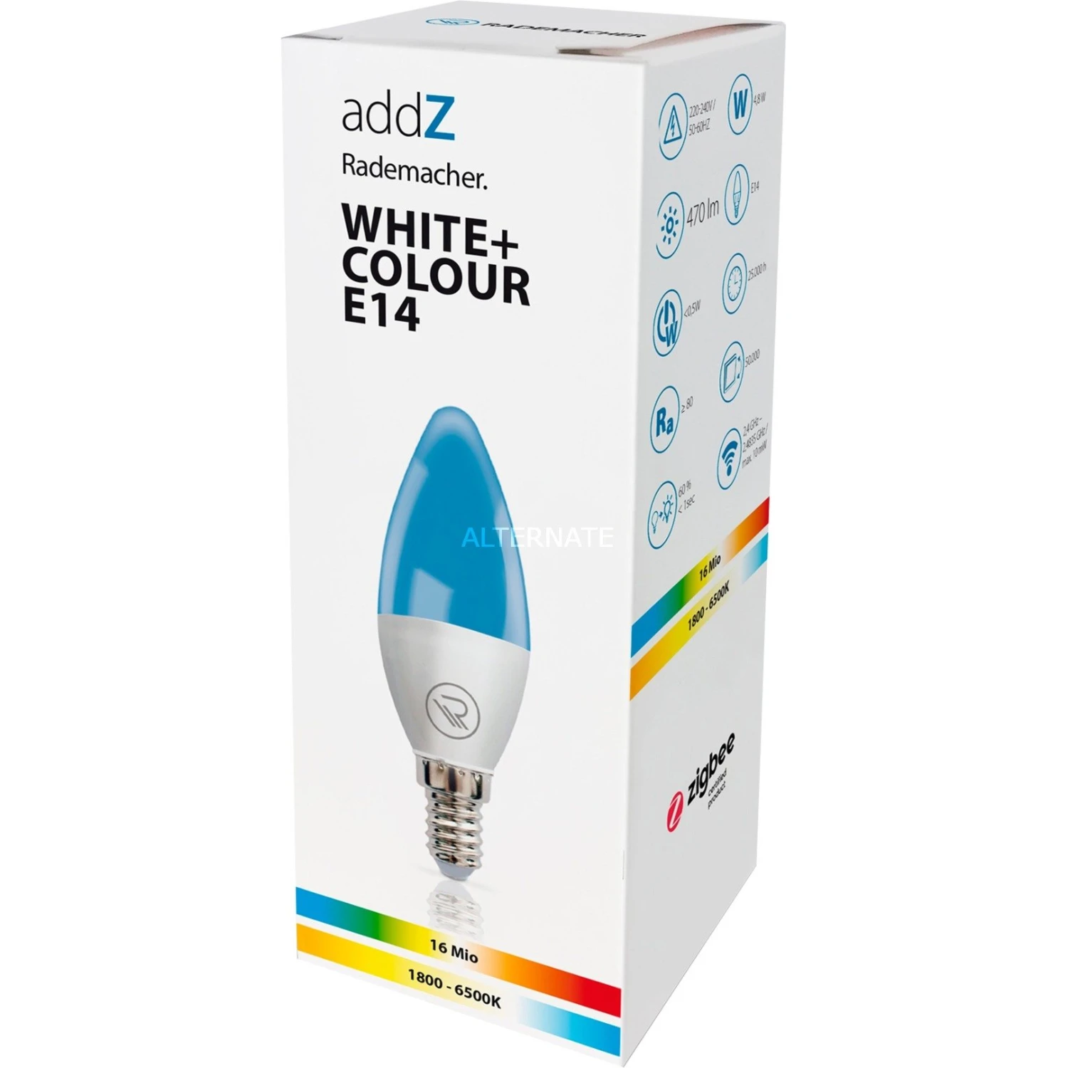 Die addZ White + Colour E14 LED ist ein smartes Leuchtmittel, das warmweißes bis kaltweißes oder farbiges Licht erzeugt. Dabei erreicht sie eine Helligkeit von bis zu 470 Lumen und lässt sich per App ganz einfach dimmen und an die verschiedensten Beleuchtungsanforderungen anpassen. Dabei ist diese LED-Lampe dank Zigbee-Kompatibilität nicht nur mit den HomePilot-Produkten von Rademacher kombinierbar, sondern kann auch mit kompatiblen Geräten anderer Hersteller gesteuert werden.