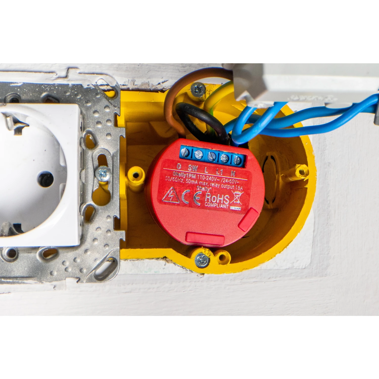 Der Wi-Fi-Relaisschalter Shelly 1PM ist für den Einbau in eine Standard-Unterputzkonsole hinter Steckdosen und Lichtschaltern vorgesehen. So lassen sich Geräte steuern und überwachen. Shelly 1PM verfügt über einen integrierten präzisen Stromzähler. Shelly 1PM wird einfach per WLAN in das Netzwerk integriert und wird über die Shelly Cloud App eingerichtet und gesteuert. So ist kein Hub nötig, um Zeitpläne zu erstellen oder den Verbrauch auszulesen.