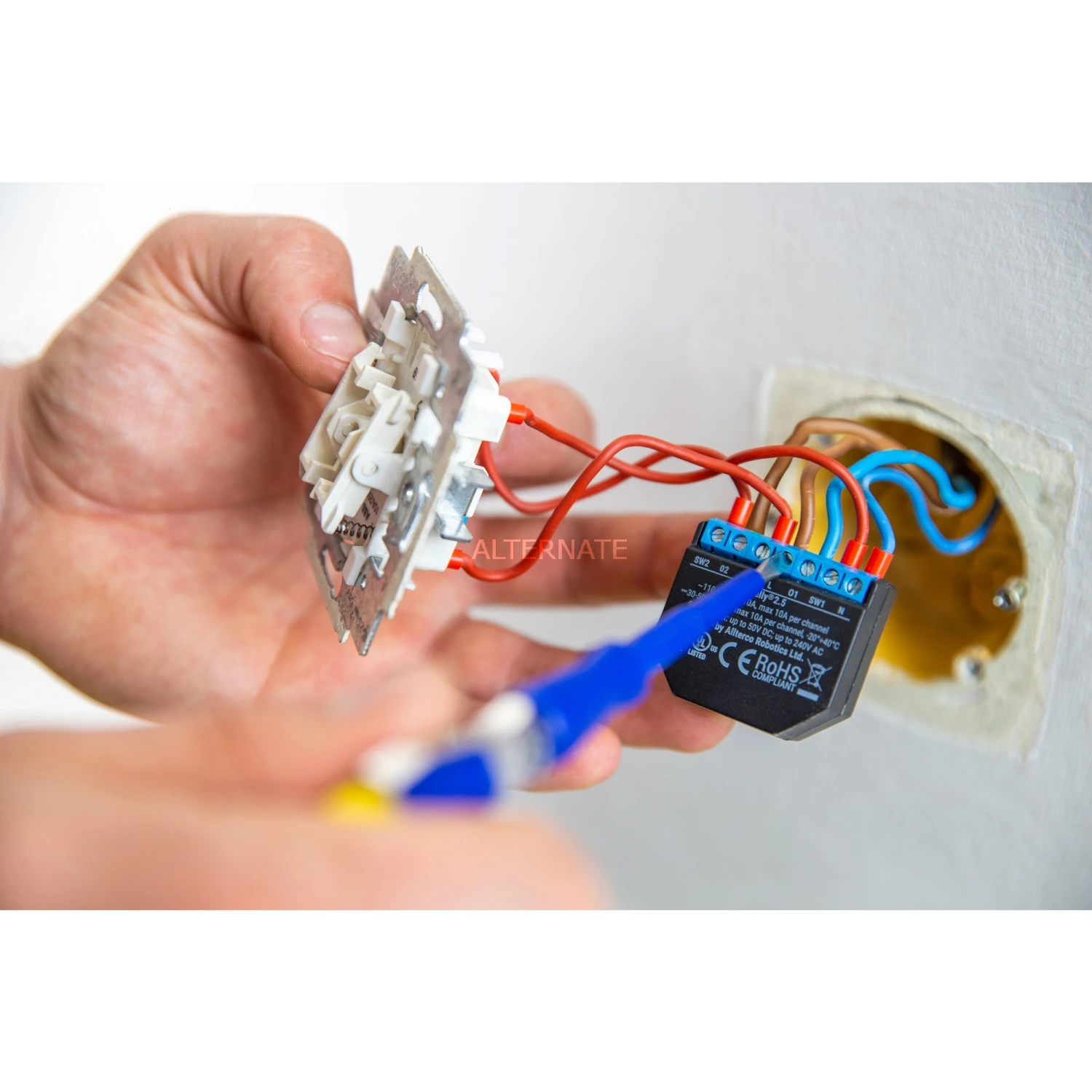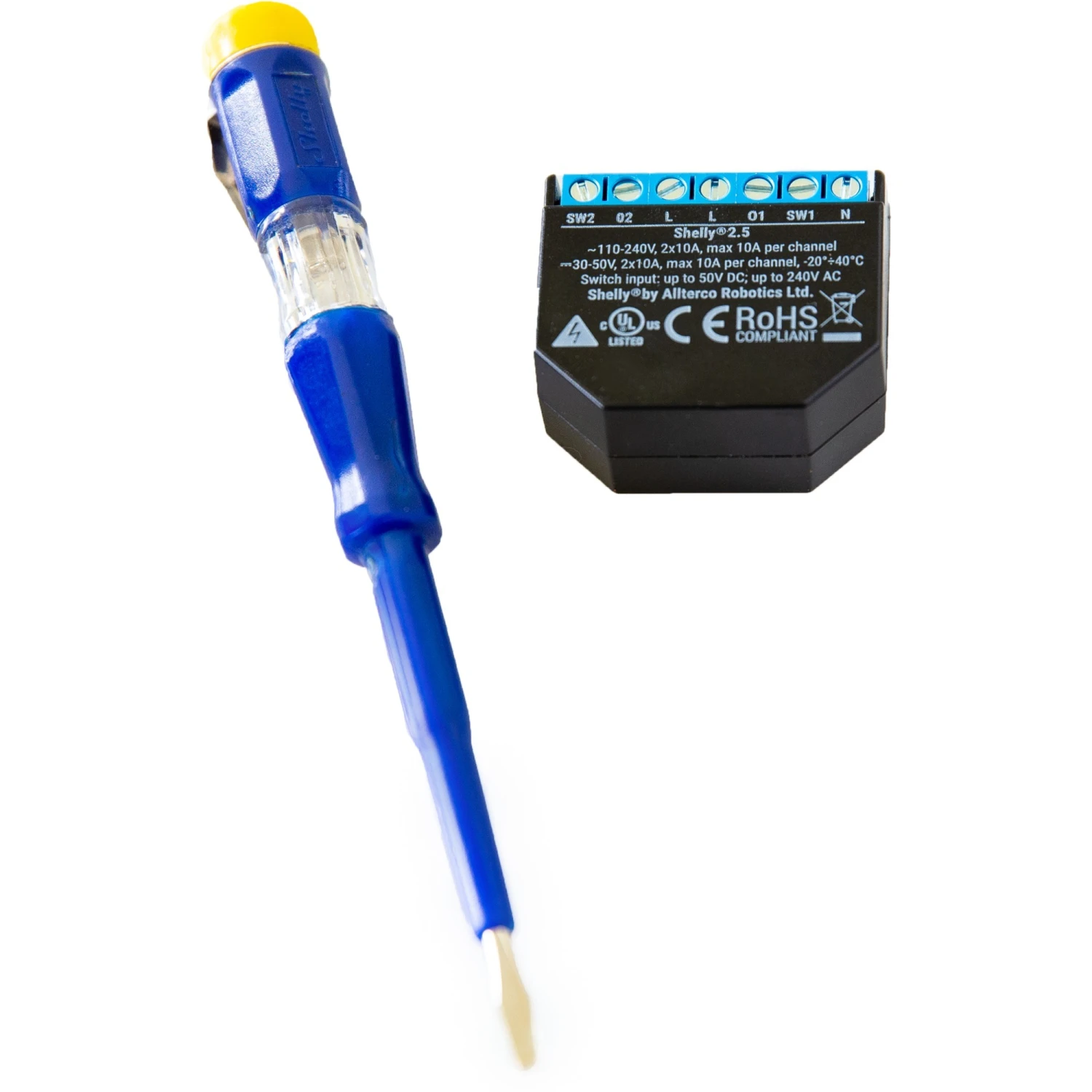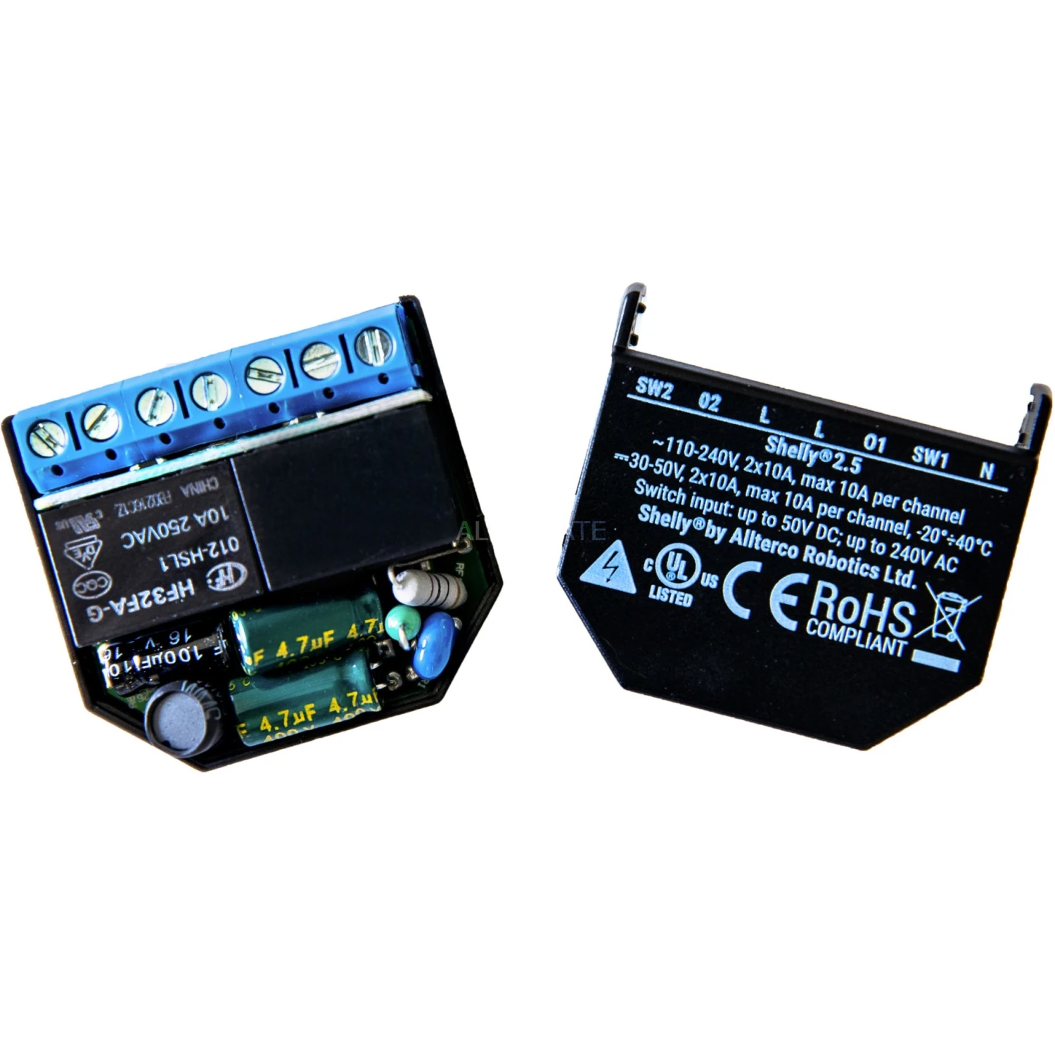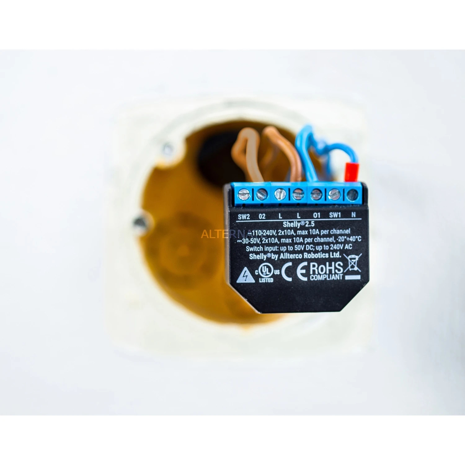 Mit dem Shelly 2.5 Relais lassen sich 2 unabhängige Stromkreise mit nur einem Gerät steuern. Shelly 2.5 kann sich mit jedem Wi-Fi-Netzwerk verbinden oder als Access Point arbeiten, sodass kein Hub nötig ist. Das Relais verfügt über einen präzisen Leistungsmesser. So behält man den Gesamtverbrauch aller angeschlossenen Geräte im Auge behalten.