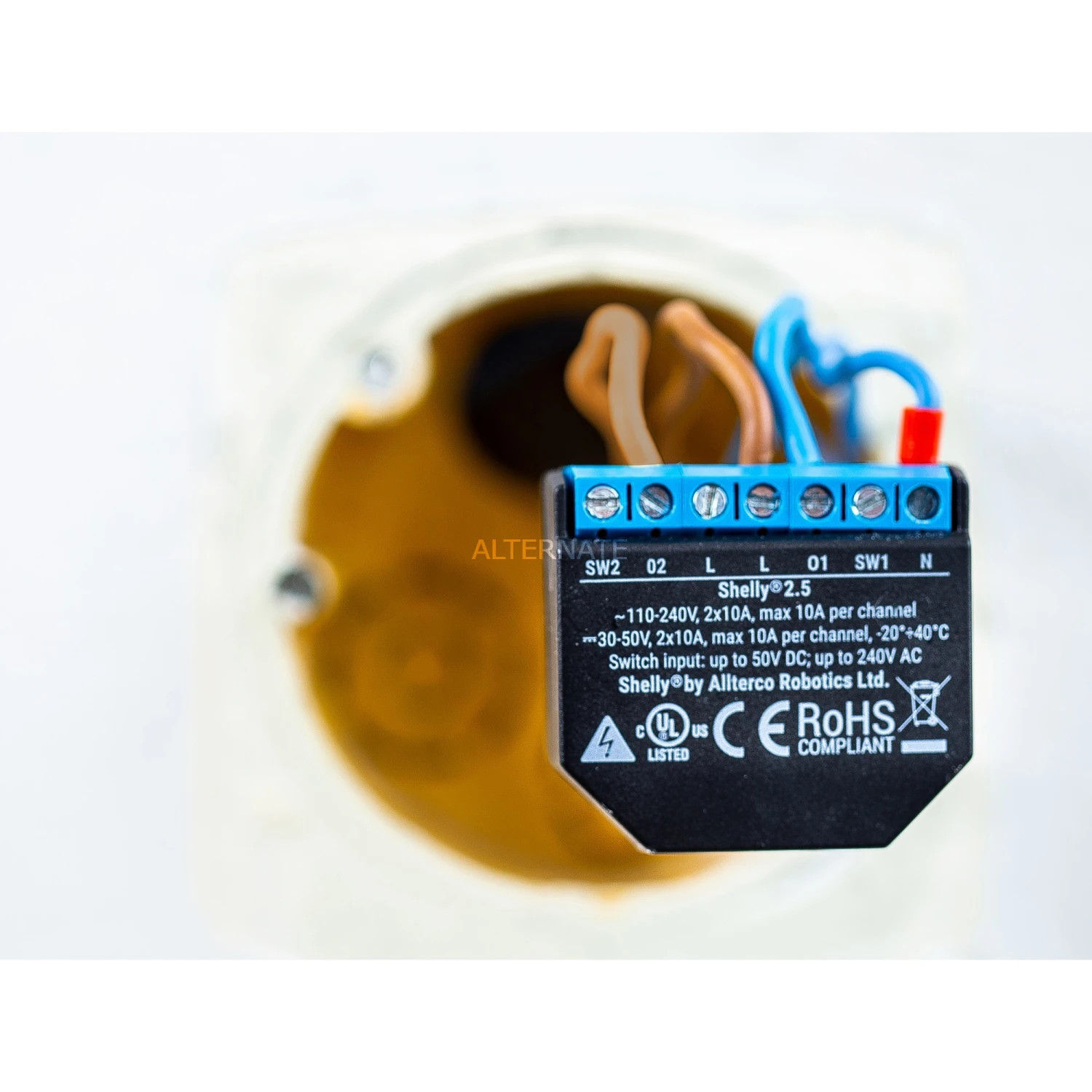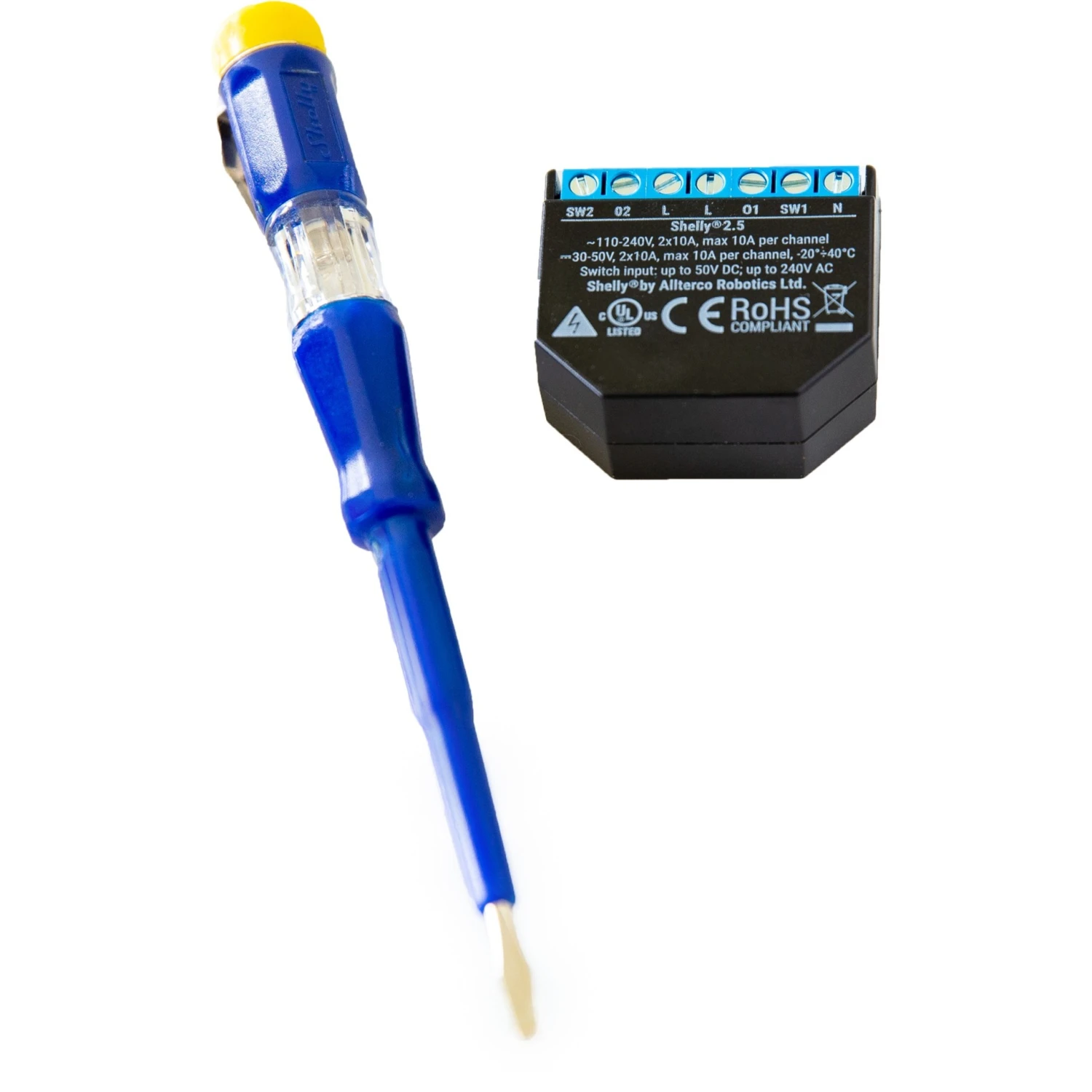 Mit dem Shelly 2.5 Relais lassen sich 2 unabhängige Stromkreise mit nur einem Gerät steuern. Shelly 2.5 kann sich mit jedem Wi-Fi-Netzwerk verbinden oder als Access Point arbeiten, sodass kein Hub nötig ist. Das Relais verfügt über einen präzisen Leistungsmesser. So behält man den Gesamtverbrauch aller angeschlossenen Geräte im Auge behalten.